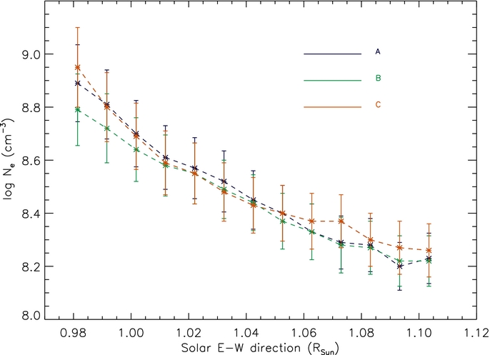 Several ions provide line intensity ratios that can be used to measure the plasma electron density. However, signal to noise limited the maximum height where each ratio was able to provide meaningful electron density measurements. The Fe xii 186.8/195.1 intensity ratio proved to be the less noisy and allowed us to determine the electron density throughout the entire range of heights spanned by the observations. Figure 5 shows the results that the electron density decreases exponentially with height, and no significant difference is observed between the three regions. If we assume that the plasma is plane parallel and in hydrostatic equilibrium, the rate of density decrease in the 1.02–1.07 R☉ range corresponds to a plasma electron temperature of T ≃ 3.8 × 106 K, significantly larger than typical quiet Sun coronal temperatures (Phillips et al. 2008, and references therein).