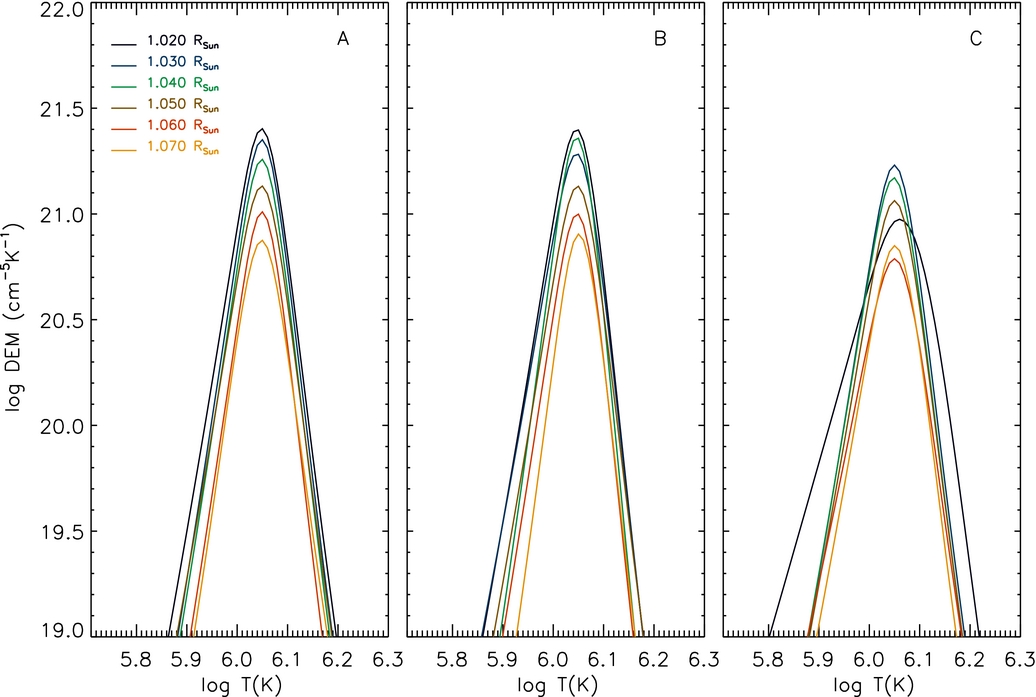 Standard image High-resolution imageThe plasma DEM curves were measured for all three data sets and the results are shown in Figure 6. There are a few comments to the results. First, all three regions show qualitatively the same plasma distribution, although region C has slightly lower DEM curves. Second, all DEM curves are peaked around log T = 6.05, with a full width at half-maximum Δlog T ≃ 0.07: the plasma along the line of sight (LOS) is rather tightly clustered around the peak temperature. The DEM peak temperature is a factor ≃ 3 lower than the temperature derived by the density scale height. Third, the DEM peak values decrease monotonically with height, but they do not significantly change their shape, with the only exception being the curve at 1.02 R☉ in the C data set.