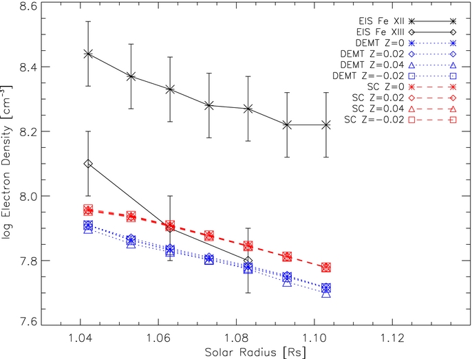 Standard image High-resolution imageTo compare the electron density obtained by EIS, DEMT, and the model, we extract the LOS density at several locations around the B data set in the EIS observation for different solar radii from 1.042 to 1.103 R☉. For the EIS observation, we show both the density derived from Fe xii and Fe xiii. The comparison result is shown in Figure 7. Since the location of EIS observation is the quiet Sun region, there are no significant differences at different locations for the densities predicted by the SC model and DEMT. The densities provided by SC and DEMT are very close as already shown in Figure 3. However, the density derived from EIS Fe xii is higher than the model and DEMT density by a factor of ∼2, while the density derived by the Fe xiii ratio is in good agreement. The disagreement between Fe xii and Fe xiii derived by EIS ratios was noted in previous studies (Young et al. 2009; Watanabe et al. 2009). In all cases Fe xii densities were higher than Fe xiii ones. The comparison made in this study shows that the Fe xiii-derived densities are more consistent with model and DEMT than Fe xii-derived densities. The agreement between the Fe xiii and DEMT density values, obtained with different techniques, reinforces the conclusion drawn by Young et al. (2009) and Watanabe et al. (2009) that Fe xii line intensities are affected by atomic physics problems. The EIS-derived temperature is around log T = 6.05 for all locations, which is well matched with the model output in Figure 3.