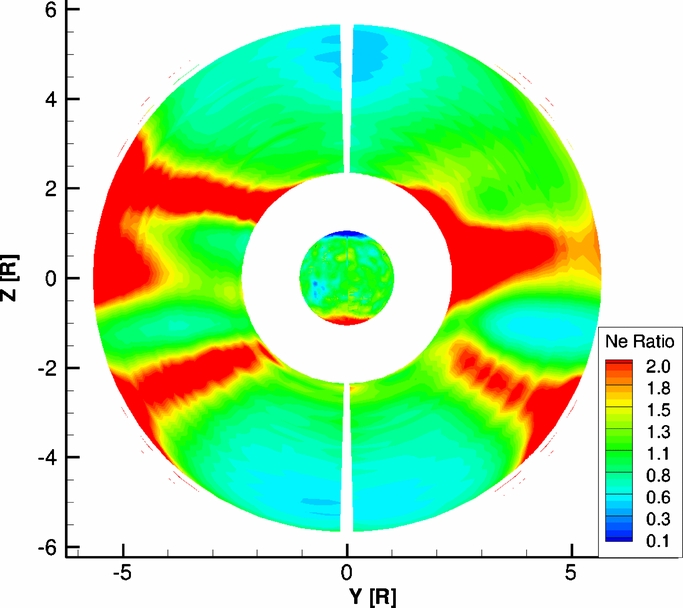 Standard image High-resolution imageAs the final evaluation of the two-temperature model near the Sun, we compare the model result with the tomography derivation (Frazin 2000; Frazin & Janzen 2002) from SOHO/LASCO-C2. Using the LASCO-C2 observation, the tomographic method can obtain the electron density between 2.3 R☉ and 6.0 R☉. The electron density ratio between the model and the LASCO-C2 tomographic output is then calculated and shown in Figure 8. The data near ∼6.0 R☉ are eliminated due to the relatively larger uncertainty of the tomography derivation near the boundary. In Figure 8, we can see that most of the regions have model/C2 ratio around 1.0, which means the model and C2 tomographic data are well matched. The four red streams that have a high model/C2 ratio are related to the time variation on the Sun that cannot be well captured by the steady-state solar wind model as well as the solar rotational tomography.