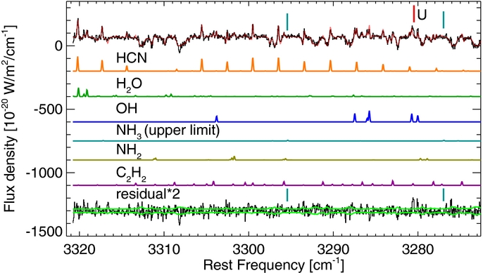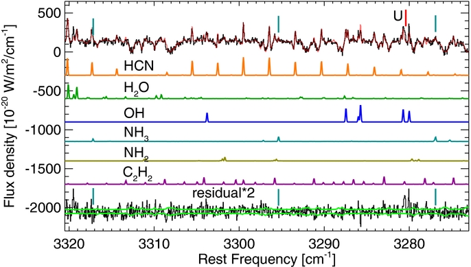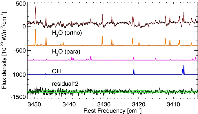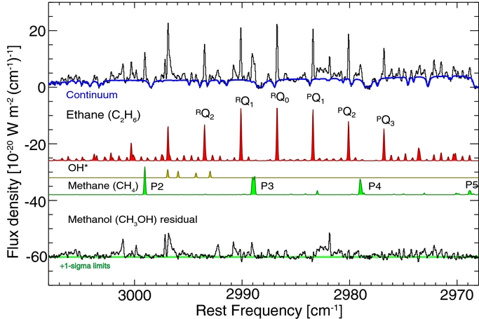 Figure 12. As for Figure 10 for January 30. At the middle, the best-fit fluorescent emission model for CH4 (orange), OH* prompt emission near 3040–3050 cm−1 (blue), and CH3D (purple) are shown. We performed a sensitive search for CH3D but did not detect it. The sum of the telluric and best-fit models (CH4 + OH) is shown in red (top) and the residual (after subtracting the best-fit model) is shown at the bottom (scaled by a factor of two). The 1σ error envelope is overplotted in green, illustrating the excellent match between observation and model.