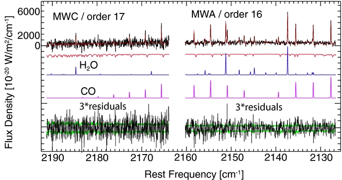 Figure 10. Detections of ortho-H2O, para-H2O, and OH* in comet Lulin on January 31. The spectrum shown (KL2, order 26) is overlain with the sum of the telluric and best-fit synthetic fluorescent emission models (red, top panel). Below are the best-fit fluorescent emission model for ortho water (orange) and para water (purple). OH* prompt emission lines are indicated in blue. At the bottom is the residual spectrum after subtracting all identified emission lines. The 1σ error envelope is overplotted in green. The best fit is for an OPR = 3:1 (statistical equilibrium).