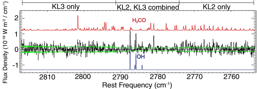 Figure 11. Detection of CH4 and OH* in comet Lulin on January 31. The combined spectrum (KL2 and KL3, order 23) is overlain with the sum of the telluric and best-fit synthetic fluorescent emission model (red, top panel). At the middle are shown fluorescence models for the three spin components of CH4 (A: orange, E: purple, F: blue), and for OH prompt emission lines near 3040–3050 cm−1 (olive). At the bottom is the residual with the best fit models subtracted (scaled by a factor of 2). The 1σ error envelope is overplotted in green, illustrating the exceptional quality of the fits. The best fit is for statistical equilibrium (A:E:F 5:2:9, Trot > 60 K).