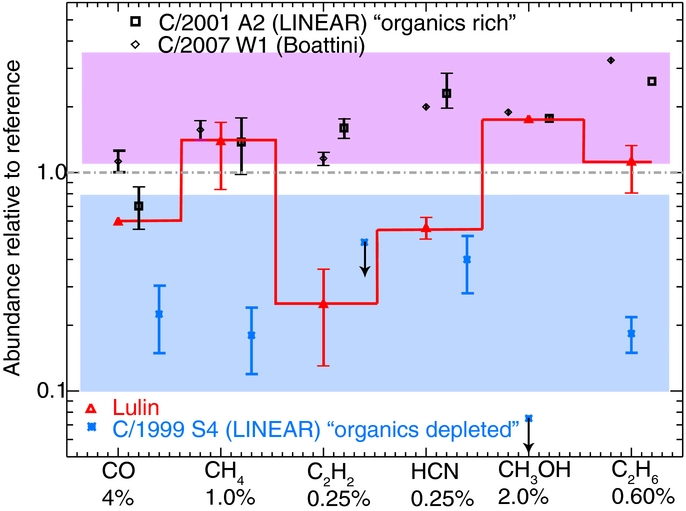 Standard image High-resolution imageof trace species relative to H2O. In particular, compare the large differences among CH3OH, CH4, C2H2, and HCN in Lulin, from more abundant to much less than the median in Figure 8.