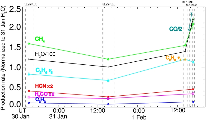 Figure 9. Plot of total production rate over time for H2O (black plus, divided by 100 for clarity), CH4 (green diamonds), C2H6 (aqua triangles), HCN (red asterisks, multiplied by 2 for clarity), C2H2 (blue circles), H2CO (purple squares, multiplied by two for clarity), and CO (teal cross) in Lulin illustrating the changes in overall production rates, in particular the dramatic increase on February 1. All values are normalized to the 31 January water production rate. Note also, the changes in relative abundance of, for example, CH4 over the three nights. The time increments over which the observations were taken are indicated with vertical dashed lines.