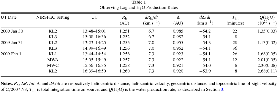 | UT Date | NIRSPEC Setting | UT | Rh | dRh/dt | Δ | dΔ/dt | Tint | Q(H2O) |