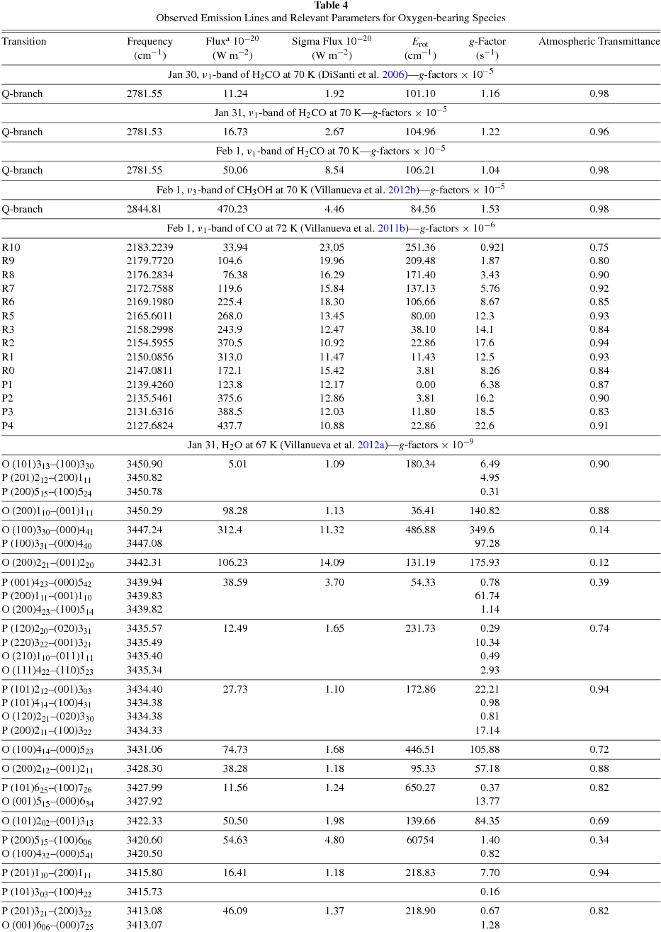 Data were processed using custom algorithms to achieve dark subtraction, flat fielding, and removal of high dark current pixels and cosmic ray hits. Detailed descriptions of the reduction procedures and flux calibration (achieved through observations of infrared standard star BS 4689) can be found in Villanueva et al. (2011b), Radeva et al. (2010), Bonev (2005, Appendix B), and references therein. Atmospheric spectra were synthesized using the Line-By-Line Radiative Transfer Model (Clough et al. 2005), which was optimized for Mauna Kea's atmospheric conditions (see Villanueva et al. 2011a). We used these models to assign wavelength scales to the extracted spectra and to determine column burdens for the absorbing species in Earth's atmosphere. The atmospheric model was binned to the resolution of the comet spectrum, normalized, and scaled to the comet's continuum level. The residual cometary line fluxes were obtained by subtracting the atmospheric model from the processed cometary spectra (row-by-row), and the measured residual fluxes for cometary emission lines were then corrected for the monochromatic transmittance at the Doppler-shifted position of each line. Line-by-line spectral identifications, rest frequencies, and transmittance-corrected fluxes are provided in Tables 2, 3, and 4.