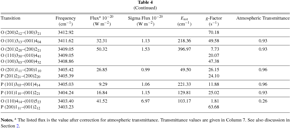 | Transition | Frequency | Fluxa 10−20 | Sigma Flux 10−20 | Erot | g-Factor | Atmospheric Transmittance |