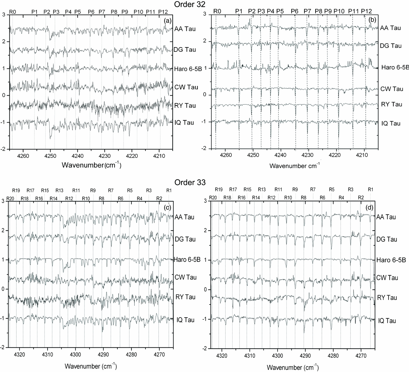 Figure 2. K-band spectra showing 12CO v = 2–0 overtone lines for six sources. Spectra have been compensated for Doppler shift, normalized and vertically shifted for comparison purposes. The locations of prominent 12CO absorption features are marked by vertical dotted lines. (a) K-band order 32 observed data, (b) K-band order 32 with the stellar photosphere removed, (c) K-band order 33 observed residual spectra, and (d) order 33 with the stellar photosphere removed.
