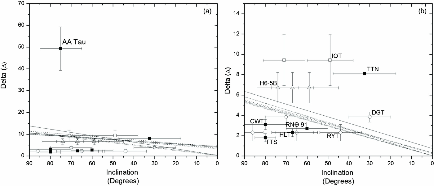 Standard image High-resolution imageIn some cases more than one discrete inclination value is listed for an individual source (see Tables 1 and 2). In order to ascertain the overall effect of these alternate values on any Δ:inclination relationship that may exist, a series of linear fits were applied to the data in Figure 4. These fits were calculated for every combination of inclination value, including alternate values for the same source. Each of these fits is shown as in Figures 4(a) and (b), these trends follow a relatively tight correlation with respect to one another. Including AA Tau in our sample (Figure 4(a)) results in linear fits covering a range from Δ = 9.9 to 13.8 at an inclination of 90°. Excluding AA Tau results in a far tighter distribution covering a Δ range of 1.2, from Δ = 5.2 to 6.4 at inclination = 90° (Figure 4(b)).