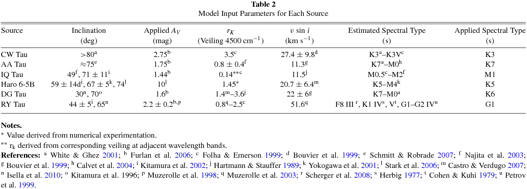 Notes. *Value derived from numerical experimentation. **rk derived from corresponding veiling at adjacent wavelength bands. References: aWhite & Ghez 2001; bFurlan et al. 2006; cFolha & Emerson 1999; dBouvier et al. 1999; eSchmitt & Robrade 2007; fNajita et al. 2003; gBouvier et al. 1999; hCalvet et al. 2004; iKitamura et al. 2002; jHartmann & Stauffer 1989; kYokogawa et al. 2001; lStark et al. 2006; mCastro & Verdugo 2007; nIsella et al. 2010; oKitamura et al. 1996; pMuzerolle et al. 1998; qMuzerolle et al. 2003; rScherger et al. 2008; sHerbig 1977; tCohen & Kuhi 1979; uPetrov et al. 1999.
