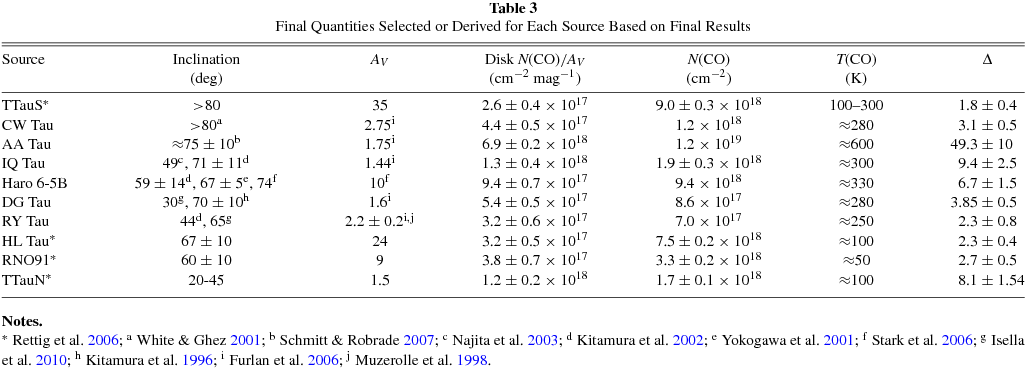 | Source | Inclination | AV | Disk N(CO)/AV | N(CO) | T(CO) | Δ |