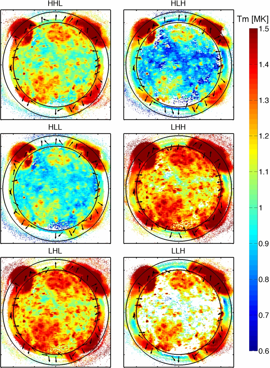 Figure 9 is similar to Figure 2, except that it shows how the spatial distribution of the up and down loops differs according to the location in the error box. While some differences can be noted, none of these changes exhibit obvious systematic trends, so the overall pattern does not change. Figure 10 is similar to Figure 8, but instead it shows the results from the corners of the error boxes. While the derived temperature change, the gradient directions do not, so all corners of the error box show consistency with the up/down loop interpretation.