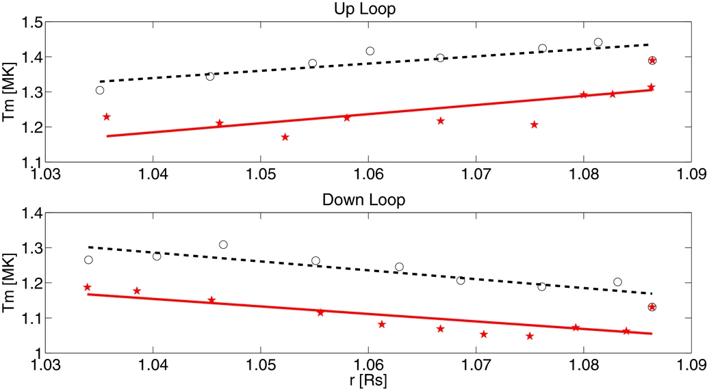 Figure 1. Linear least-squares fits of the form Tm = a r + b to determine loop classification as "up" (a > 0), or "down" (a < 0). Top: two legs of a up loop, with black circles representing the DEMT Tm values of one leg and red stars representing the other. The red solid line is the fit to the red stars and the black dashed line is the fit to the black circles. Bottom: similar to the top panel, but for a down loop. The black dashed and red solid curves in the upper and lower panels have quality-of-fit values R2 of 0.67, 0.51, 0.76, and 0.59, respectively. Since we only accept loops with R2 > 0.5 (for this stage in the analysis), these fits are fairly typical.