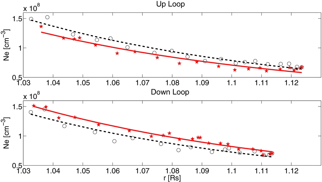 Figure 5. Upper and lower panels give examples of fits to determine the base density Ne0 and density scale height λN, for an up and a down loop, respectively (Equation (4)). The data points are the DEMT values of the electron density Ne. The symbols and line styles are as in Figure 1. The black dashed and red solid curves in the upper and lower panels have quality-of-fit values R2 of 0.95, 0.94, 0.92, and 0.97, respectively. Since we only accept loops with R2 > 0.9 for the scale-height analysis, these fits are fairly typical.