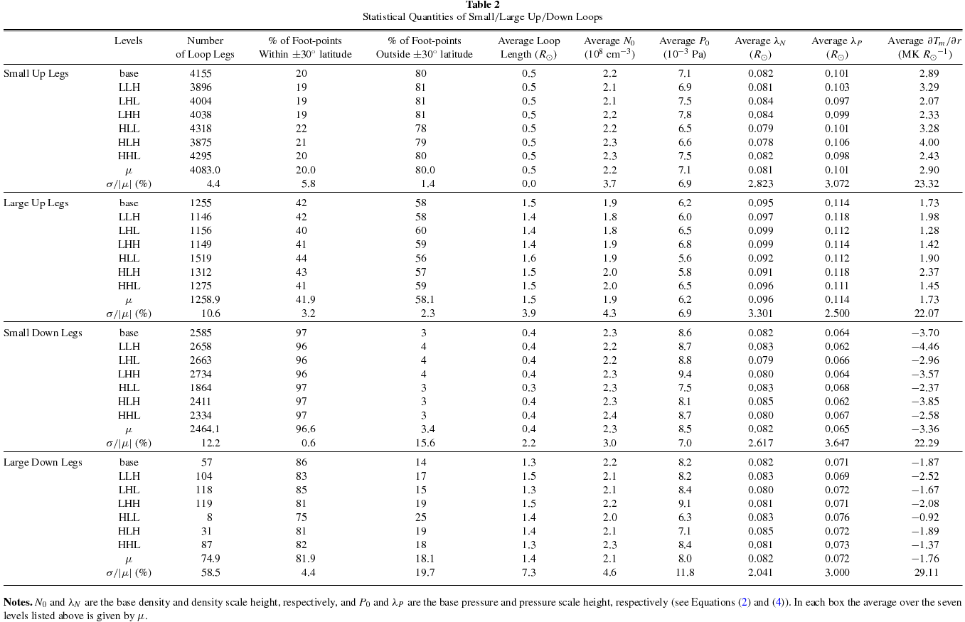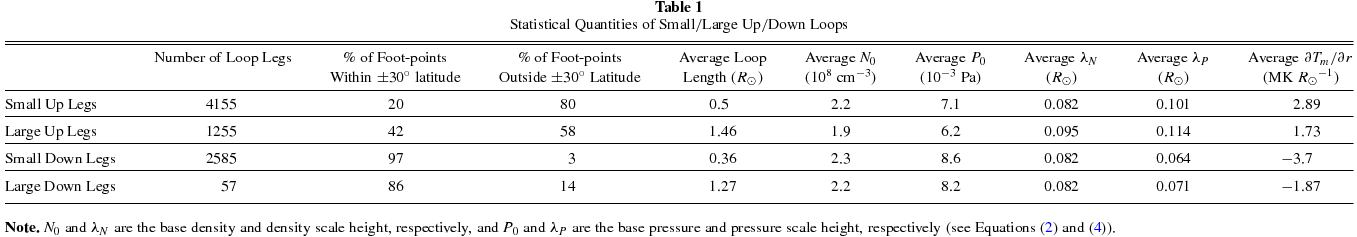 | of Loop Legs | Within ±30° latitude | Outside ±30° latitude | Length (R☉) | (108 cm−3) | (10−3 Pa) | (R☉) | (R☉) | (MK R☉−1) | ||