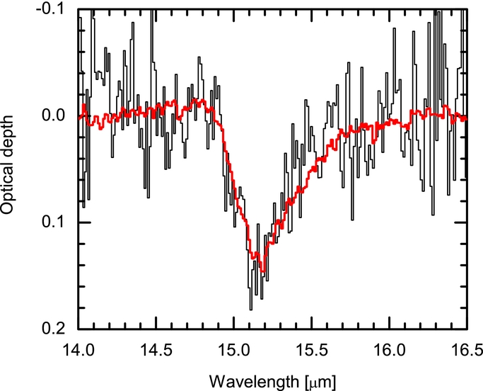 Standard image High-resolution imageFigure 10. Optical depth spectrum of J15542044−0254073 (star H) in the region of the 15.2 μm solid CO2 bending-mode absorption feature (black curve, Spitzer-IRS SH-mode data; see Figure 6). The red curve is an overlay of the corresponding Elias 16 profile (Bergin et al. 2005), scaled to match the feature in star H.