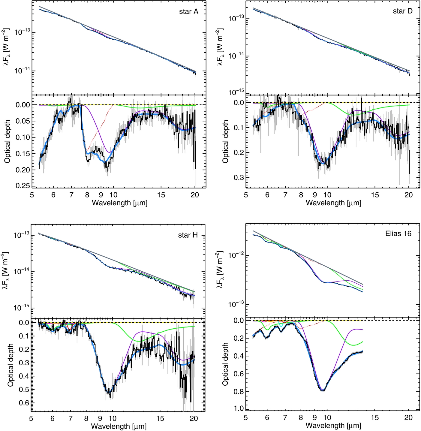 Figure 11. Spitzer-IRS spectra and modeled optical depth spectra of stars A, D, H, and Elias 16. Upper panel: observed SEDs (black curves), shown with unabsorbed continua (gray curves) and best-fit model SEDs (blue curves). Lower panel: observed optical depth spectra (black curves with gray error bars), shown with best-fit model optical depth spectra (blue curves). The total extinction is modeled as a linear combination of amorphous silicates (olivine + pyroxene: violet curve), H2O ice (green curve), and gaseous photospheric CO and SiO absorption from K- and M-type giants (red dotted curve). The 5–8 μm absorption toward star H and Elias 16 is modeled by five empirical ice absorption profiles from Boogert et al. (2008): C1 (magenta curve), C2 (orange curve), C3 (cyan curve), C4 (red solid curve), and C5 (yellow curve).