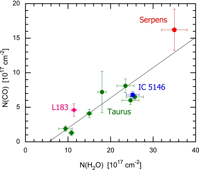 Figure 15. Correlation of solid-phase column densities N(CO) vs. N(H2O), comparing our detection toward one line of sight in L183 (pink diamond) with available data for field stars behind other clouds (Chiar et al. 2011; Lentine et al. 2012; Whittet et al. 2007, 2009): Taurus (green circles), IC 5146 (blue square), Serpens (red pentagon). The line is the unweighted linear least-squares fit to the data for all clouds.