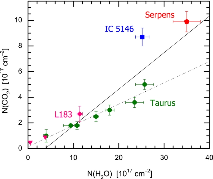 Standard image High-resolution imageThe N(H2O) versus N(CO2) correlation (Figure 16) is statistically similar but qualitatively different. The unconstrained linear fit to all points (solid line) yields r = 0.89. However, as previously noted (Whittet et al. 2009), there is evidence of systematically lower CO2 abundances in Taurus compared with IC 5146 and Serpens, as suggested by the dotted line fitted to Taurus data alone. The available data for L183 are consistent with either trend. The correlations are consistent with a relatively small (and possibly null) intercept in comparison to that for N(H2O) versus N(CO): this arises from the fact that the majority of the CO2 is expected to be in the polar (water-rich) ice layer, as the result of efficient CO oxidation during the initial phase of mantle growth (Whittet et al. 2009 and references therein).