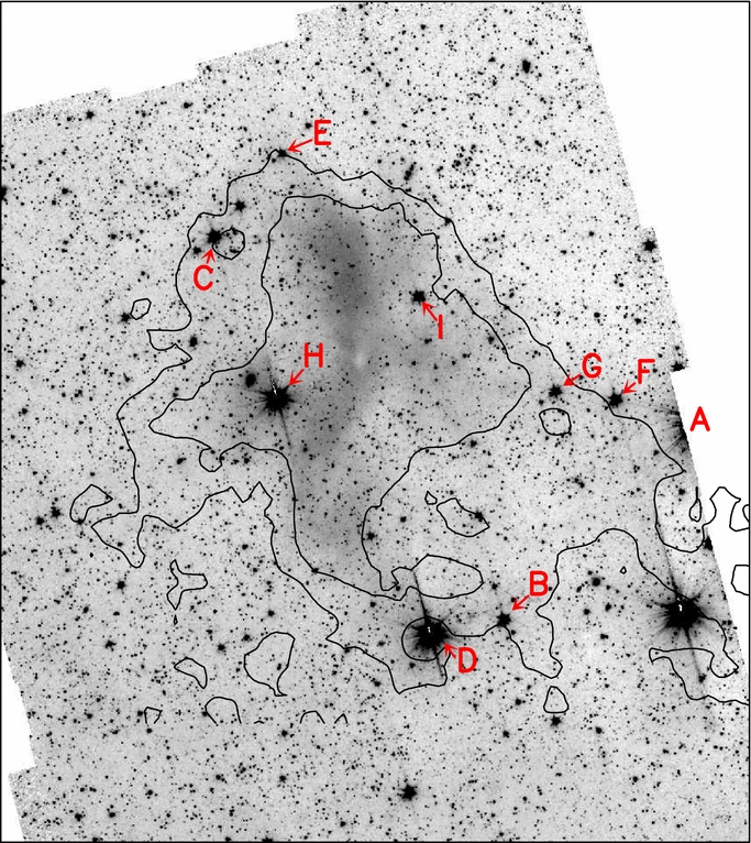 Standard image High-resolution imageStars in Table 1 were prioritized as candidates for spectroscopy according to apparent brightness and the goal of covering the available range of extinction. Nine stars for which spectroscopic data are presented below are highlighted in red in Figure 1 and listed in Table 2. Their distribution with respect to the cloud core is shown in Figure 2, which overlays extinction contours from Pagani et al. (2004) on a mosaic of 3.6 μm IRAC images; program stars are labeled alphabetically in order of increasing extinction (see Table 3 and Section 3.1). Of these, star H (J15542044−0254073, AV ≈ 12.5 mag) proves to be a particularly valuable probe of interstellar features, as it is among both the brightest and the most reddened in the set. We note, however, that all of our program stars are separated by at least 3 arcmin from the dense core of the cloud, in which extinctions as high as AV ∼ 150 mag have been estimated (Pagani et al. 2004).