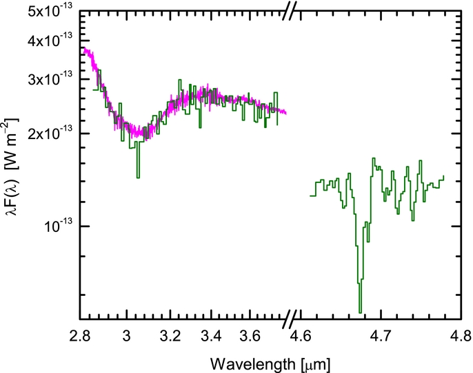Figure 4. IRTF-SpeX and UKIRT-CGS2 spectra (magenta and green, respectively) of the program star H (J15542044−0254073). The spectral range includes absorption features of H2O and CO ices centered near 3.05 and 4.67 μm, respectively (note the break and scale change on the wavelength axis between the two segments). The UKIRT-CGS2 spectrum yields the only available detection of CO ice in L183 to date.