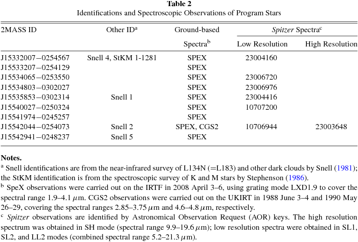 Notes. a Snell identifications are from the near-infrared survey of L134N (=L183) and other dark clouds by Snell (1981); the StKM identification is from the spectroscopic survey of K and M stars by Stephenson (1986). b SpeX observations were carried out on the IRTF in 2008 April 3–6, using grating mode LXD1.9 to cover the spectral range 1.9–4.1 μm. CGS2 observations were carried out on the UKIRT in 1988 June 3–4 and 1990 May 26–29, covering the spectral ranges 2.85–3.75 μm and 4.6–4.8 μm, respectively. c Spitzer observations are identified by Astronomical Observation Request (AOR) keys. The high resolution spectrum was obtained in SH mode (spectral range 9.9–19.6 μm); low resolution spectra were obtained in SL1, SL2, and LL2 modes (combined spectral range 5.2–21.3 μm).