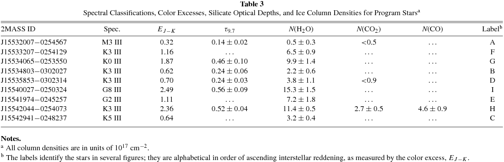 Table 3. Spectral Classifications, Color Excesses, Silicate Optical Depths, and Ice Column Densities for Program Starsa