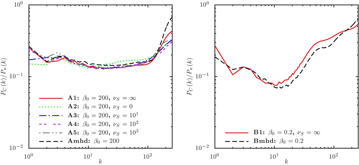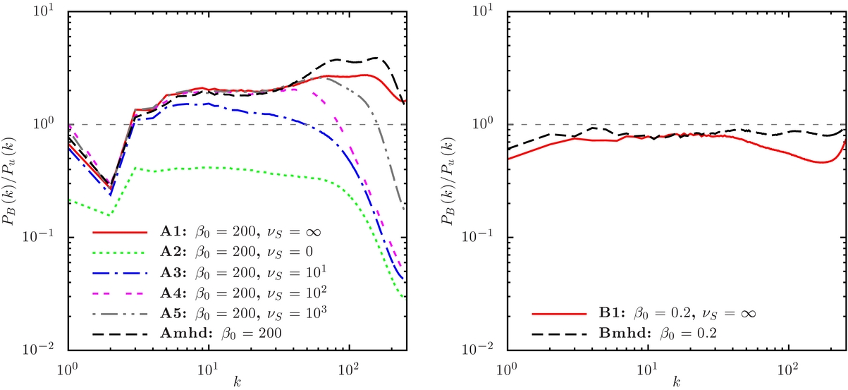 Standard image High-resolution imageFigure 12. Ratio between the power spectrum of the magnetic field PB(k) and the velocity field Pu(k) for the same models as in Figure 6 (see Table 1 and Section 4.4 for details).