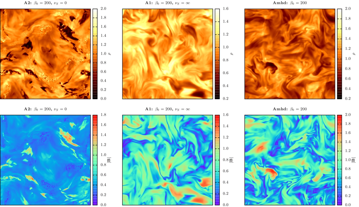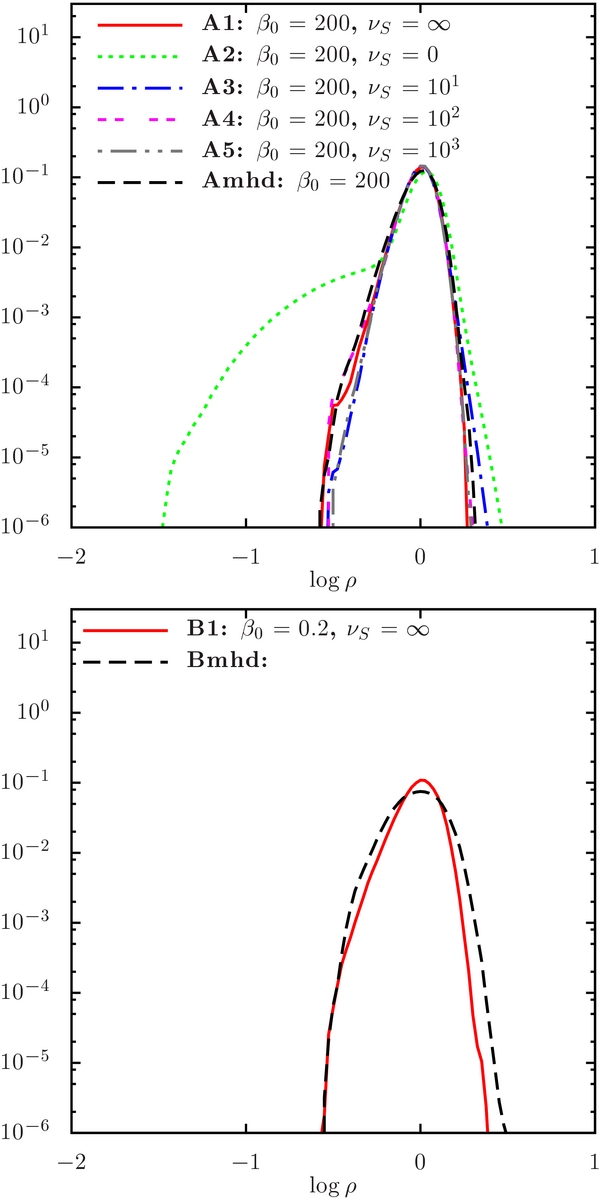 In spite of the results above, a more accurate treatment of the energy evolution will be desirable in future work. For instance, as discussed earlier, the lack of a proper treatment for the heat conduction makes the linear behavior of the mirror instability in a fluid description different from the kinetic theory, leading to an overstability of the system. A higher order fluid model reproducing the kinetic linear behavior of the mirror instability (see Equation (9)) would enhance the effects of this instability in the models with finite νS, probably producing more small-scale fluctuations compared to the present results (see Figure 4). The effects of the mirror instability on the turbulence statistics have been extensively discussed in Kowal et al. (2011b; see also next section), where a double-isothermal closure was used. This closure is able to reproduce the threshold of the mirror instability given by kinetic derivation.