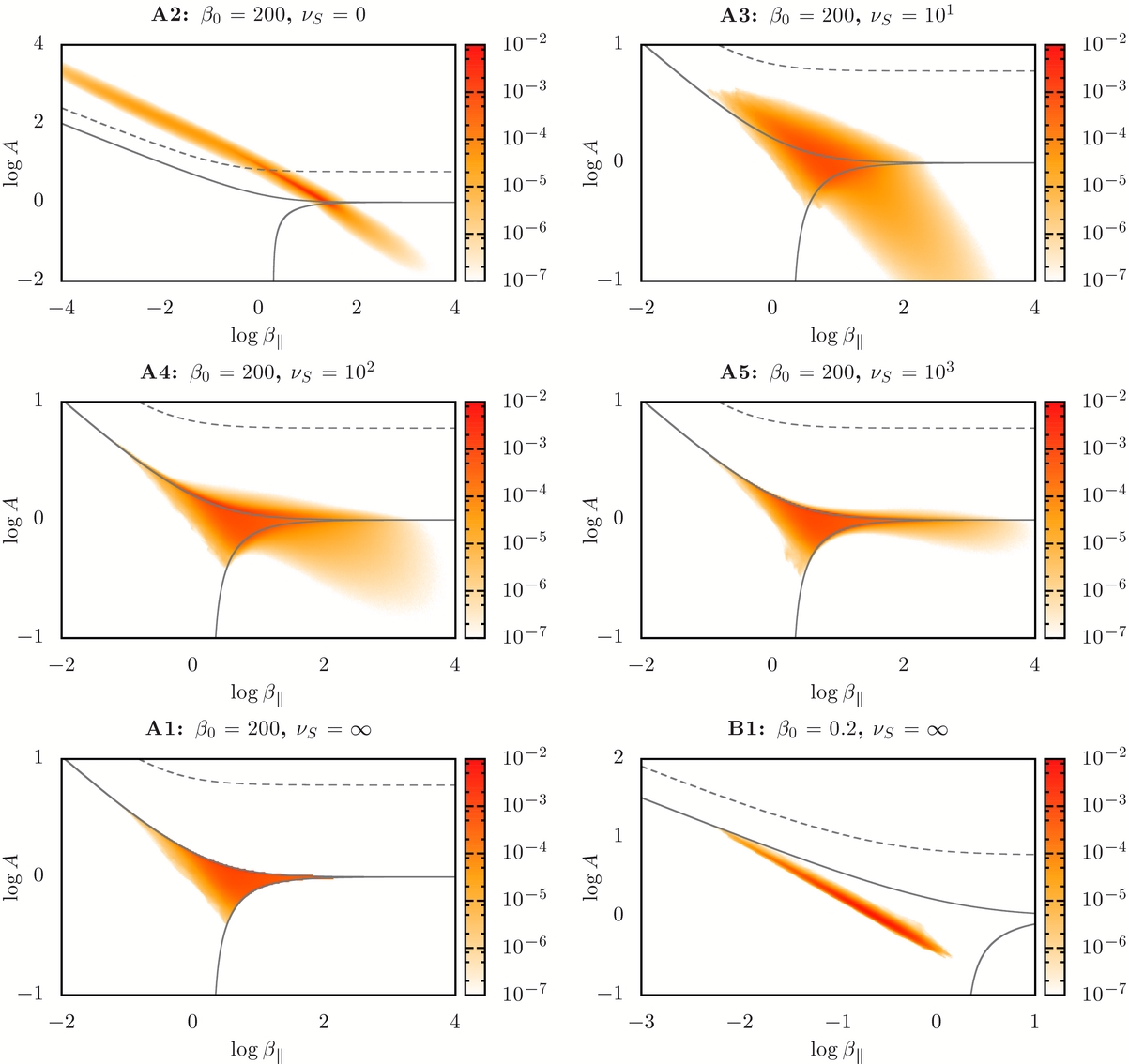 In the case νS = ∞ (see Table 1), when the plasma is in the firehose (Equation (7)) or in the kinetic mirror instability (Equation (9)) regimes, this method simply replaces the pressures p⊥ and p∥ by the values given by the corresponding marginal stability criterion (while ensuring conservation of the internal energy w = p⊥ + p∥/2).