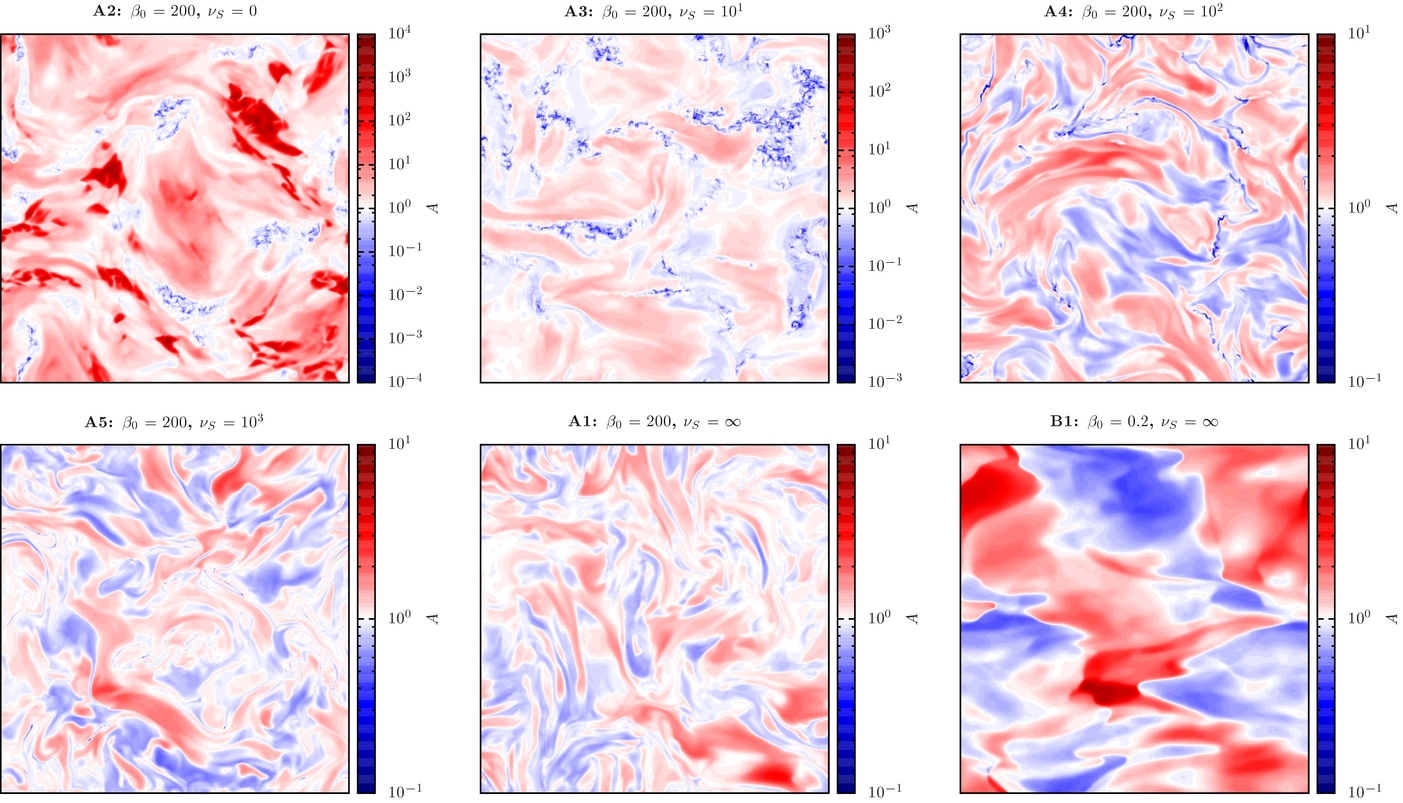We have also tested models without anisotropy relaxation (not shown here) that employed the CGL-MHD equations of state for calculating the pressure components parallel and perpendicular to the magnetic field (Equations (4) accompanied by homogeneous initial conditions, rather than evolving the last two equations in Equation (1) for the anisotropy A and the internal energy, respectively). Although there are some intrinsic differences due to larger local values of the sound speeds, the overall behavior of these models was qualitatively similar to the models with νS = 0 presented here.