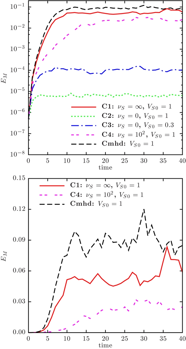 Figure 8. Time evolution of the magnetic energy EM = B2/2 for the models starting with a weak (seed) magnetic field, models C1, C2, C3, C4, and Cmhd, from Table 1. The bottom and top panels differ only in the scale of EM. This is shown in a log scale in the top panel and in a linear scale in the bottom panel. The curves corresponding to models C2 and C3 are not visible in the bottom panel.