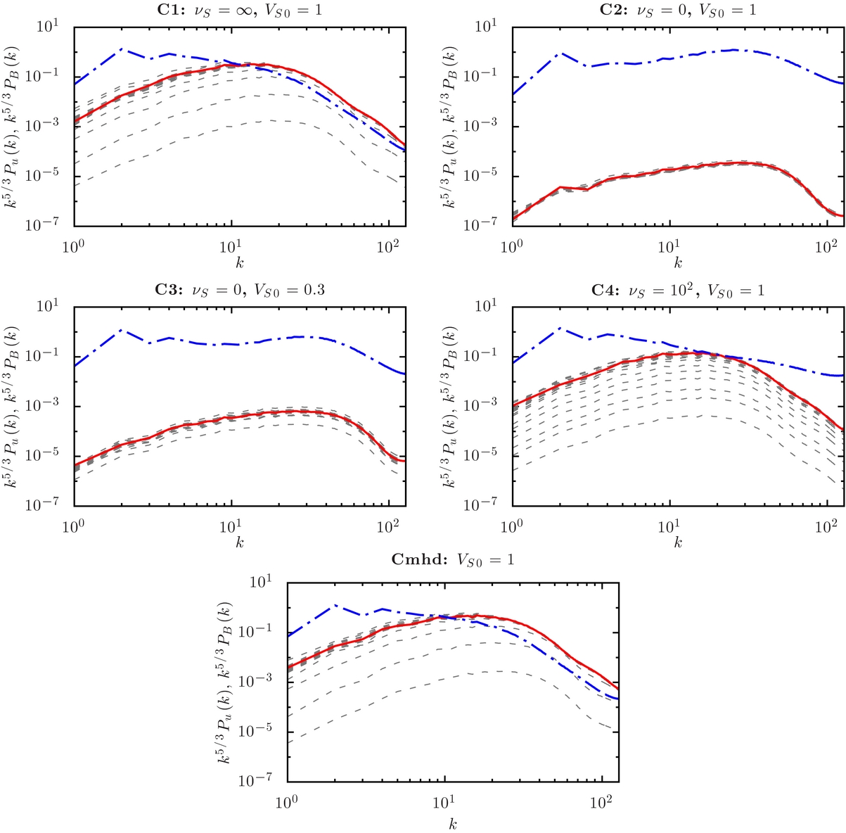 Standard image High-resolution imageFigure 9. Magnetic field power spectrum multiplied by k5/3 for the same models presented in Figure 8, from t = 2 at every Δt = 2 (dashed lines) until the final time indicated in Table 1 (solid lines). The velocity field power spectrum multiplied by k5/3 at the final time is also depicted for comparison (dash-dotted line).