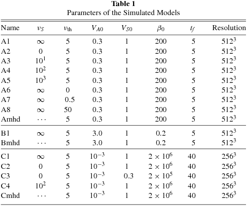 In Table 1, VA0 is the Alfvén speed given by the initial intensity of the magnetic field directed along the x-axis. Initially, the gas pressure is isotropic for all the models with an isothermal sound speed VS0. The parameter β0 is the initial ratio between the thermal pressure and the magnetic pressure.