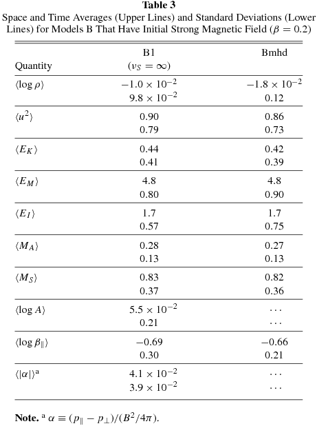 Tables 2–4 present one-point statistics in space and time for the simulated models in Table 1. The averaged quantities are listed in the leftmost column. Each column presents the averages and below it the standard deviation for each model. For the statistics, we considered snapshots spaced in time by Δt = 1, from t = 2 (Tables 2 and 3) or tf − 10 (Table 4) until tf (the tf for each model is listed in Table 1). All the values are in code units and can be converted into physical units according to the prescription given in Section 3.2. The functional definitions (in terms of the code units) of the physical quantities listed are EK = ρu2/2, EM = B2/2, EI = (p⊥ + p∥/2), MA = uρ1/2/B, MS = u(3ρ)1/2/(2p⊥ + p∥)1/2. For the collisional MHD models, the following definitions are used: EI = 3p/2, MS = u(ρ/p)1/2, β∥ = β.