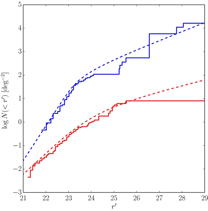 Standard image High-resolution imagePower-law fits to observations that occupy part of the range 22.5 ⩽ r' ⩽ 24 (the majority of past works) suffer a perceived flattening of the best-fit slope compared to the actual large object slope. We tested this with some basic Monte Carlo simulations of a typical on-ecliptic luminosity function survey. We adopted the best-fit H and r distributions of the hot sample, and simulated the apparent magnitude distribution that would be observed in the survey presented by Fraser et al. (2010), which found a very shallow slope of α = 0.35 ± 0.2 for objects with apparent magnitudes 21.5 ⩽ r ⩽ 24.5. We randomly generated a number of objects equal to that observed in their survey and fit a power law to the randomly generated sample, and repeated this process 1000 times. The slopes found by our simulations had a mean of 0.57 with sample deviation of 0.1. These values are typical of past efforts, though slopes as shallow as that observed by Fraser et al. (2010) occurred in only 1% of our simulations. Thus, we conclude that only with prior knowledge of the radial distribution, will analysis of the apparent magnitude distribution reveal the correct slope of the underlying absolute magnitude and size distributions.