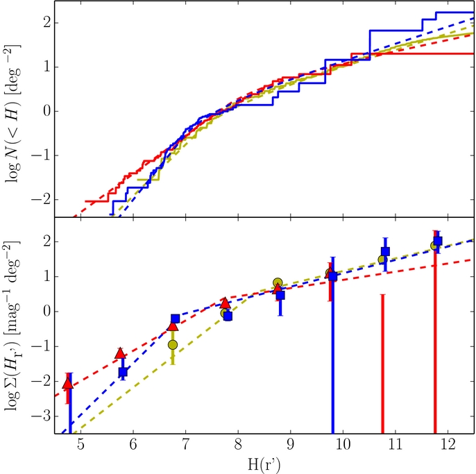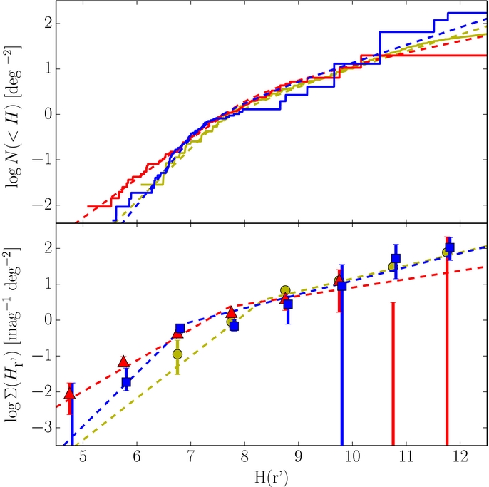 Figure 1. Cumulative (top) and differential (bottom) histograms of the observed absolute magnitude distributions evaluated with use of the synthetic CFEPS radial distribution. The solid lines and points present the observed distributions. Points and lines are color coded according to the populations they show—red triangles: hot population, blue squares: cold population, yellow circles: Jupiter Trojans. Cold population has been shifted by 0.05 mag for clarity. Error bars are the 1σ extents from the Monte Carlo calculations (see Section 3.1) and the Poissonian 1σ intervals added in quadrature. 2σ Poissonian upper limits are shown where no objects have been detected. The dashed lines represent the best-fits to the distributions (see Section 3.2).