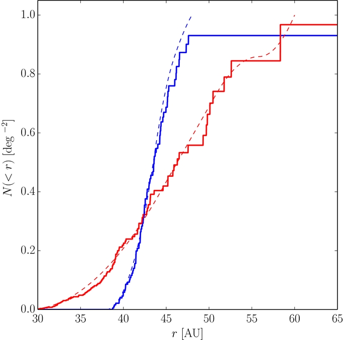 Standard image High-resolution imageFigure 3. Cumulative histograms of the observed radial distributions of the cold (blue) and hot samples. The solid and dashed lines present the observed and best-fit radial distributions found when the fits made use of the observed objects distances and the radial distribution parameters were free parameters in the fits.