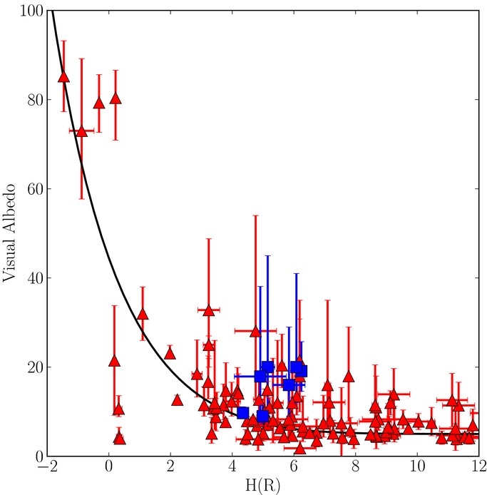 Figure 6. Visual albedo vs. absolute R-band magnitude. Blue squares denote the cold objects and red triangles denote hot objects. The black line represents the scaling of absolute magnitude with albedo, if albedo is given by ρ = (D/250 km)2 + 6% which is an adequate representation of the trend albedo with absolute magnitude of the hot population.