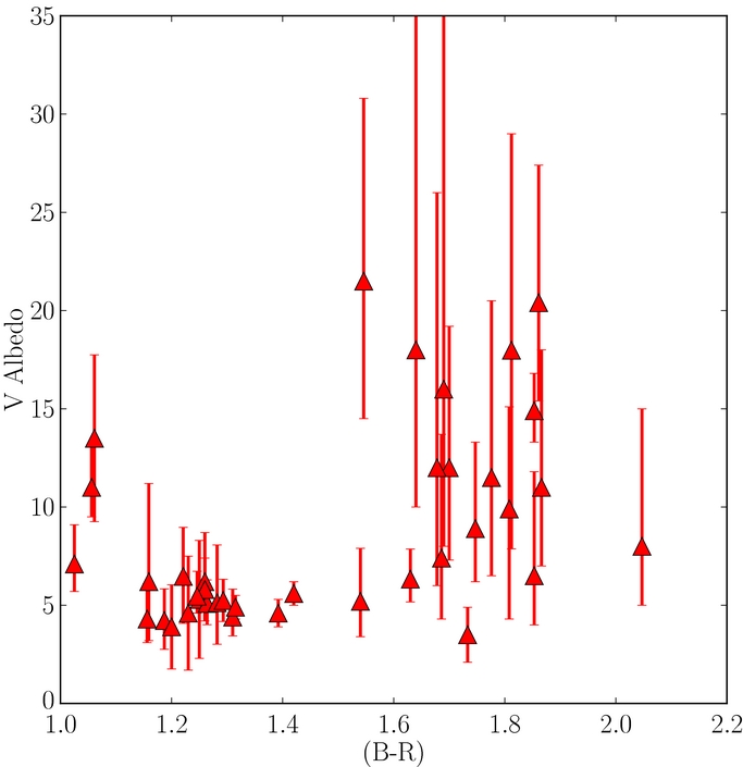 Standard image High-resolution imageFigure 7. Visual albedo vs. (B − R) color of hot KBOs with 5 ⩽ H ⩽ 10.