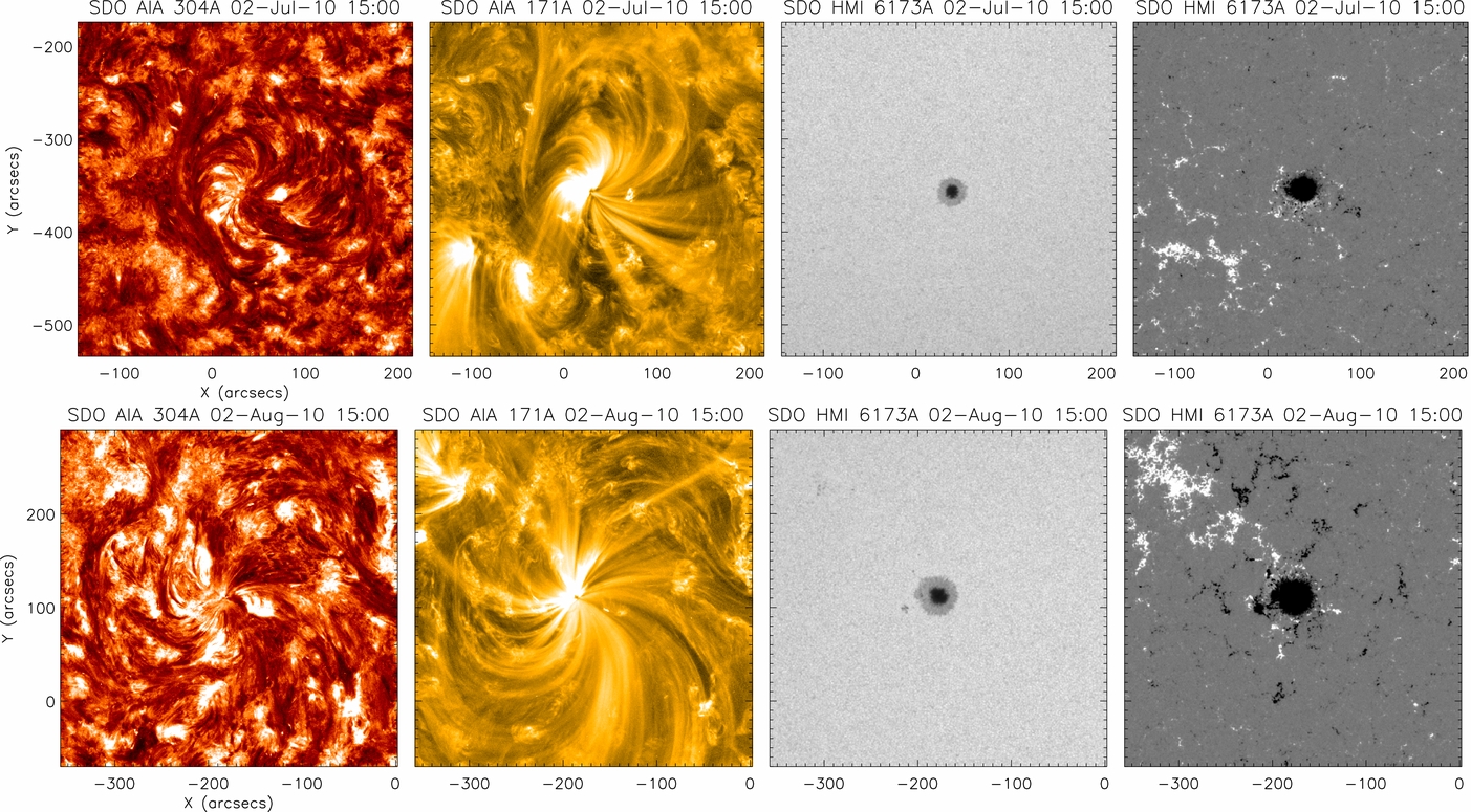 Figure 1. Context images of the two sunspots, NOAA 11084 and 11092, obtained by SDO/AIA, are shown in the top and bottom row, respectively. The images from left to right show, respectively, the filtergrams in AIA 304 Å and 171 Å channels, photospheric continuum intensity map, and longitudinal magnetogram from HMI. The AIA 304 Å and 171 Å images have been contrast enhanced by applying a high-pass filter.