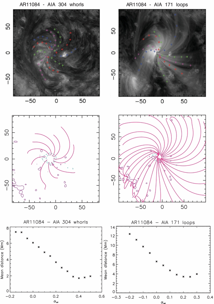 We obtain magnetic field models with different values of the force-free parameter α and integrate sets of field lines that we compare with the structures observed in AIA images. For the comparison we align the model with the data and compute the mean distance from model field lines to selected observed structures, such as EUV loops or chromospheric whirls, depending on the type of data. Each structure is defined by a series of points selected by eye on contrast-enhanced images. These selected structures are represented by colored plus signs in the top panels of Figures 2 and 3. A large number of field lines is computed in the vicinity of each structure. The distance of each field line, projected on the plane of sky, to the structure is computed. The field line minimizing this distance is selected, then new field lines are computed around it, and the procedure is continued until the minimum distance has no significant change. The last identified field line defines the minimum distance to the selected structure. This procedure is applied to an ensemble of structures (loops, fibrils), and a mean distance is defined. Repeating the above analysis for different α values defines the curves shown at the bottom of Figures 2 and 3. A detailed description of this procedure can be found in Green et al. (2002) and López Fuentes et al. (2006).