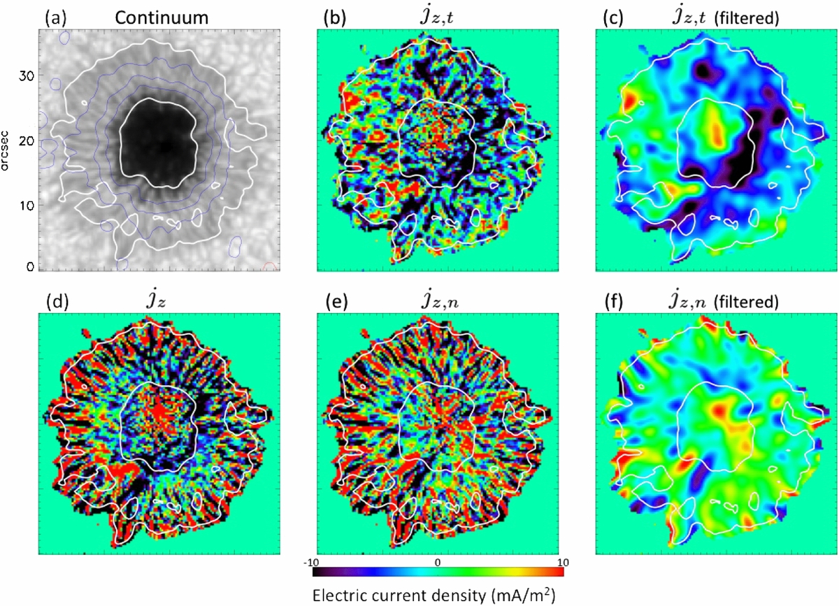 (Figure 5(c)), which has mostly negative values. On the other hand, the map of jz, n (Figure 5(e)) mostly contains the elongated ± current pattern due to the penumbral fibrils. Only weak currents remain on the low-pass-filtered