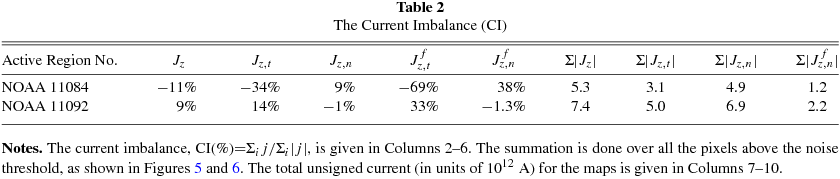 Further, in NOAA 11084 the dominant current is negative, while in NOAA 11092 the dominant current is positive. This is confirmed by a spatial integration of jz. This is also true for jz, t; however, for jz, n the dominant current sense is opposite in the two spots, i.e., positive in NOAA 11084 and negative in NOAA 11092. More precisely, we define the current imbalance (CI) as 100 × total(j)/total(|j|). The results are summarized in Table 2. We conclude that the imbalance increases for filtered cases. Moreover, the imbalance is stronger for jz, t and