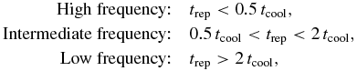 where trep is the repetition time between consecutive events and tcool is the cooling time. The intermediate frequency interval has not been discussed much in the past, but there is a new appreciation that many nanoflares may be of this type (Cargill 2014). It is convenient to define the frequency categories in terms of the temperature change of the cooling plasma. The top panels of Figure 8, explained below, show that the temperature evolution after the nanoflare can be approximated by an exponential: T(t) = T0exp (− t/tcool), where T0 is the maximum temperature reached during the event (see also Terzo et al. 2011). The temperature ratios T(trep)/T0 for each of the above frequency categories are then