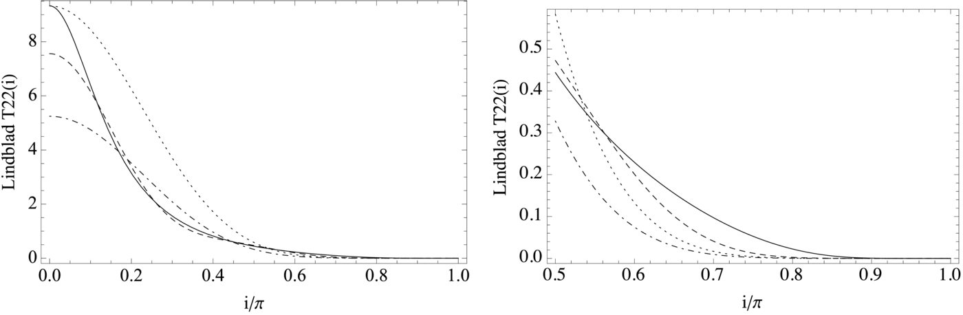 ) torque in Equation (7), which is ∝cos 8(i/2), is plotted as dotted–dashed lines. The agreement of the dotted–dashed lines with the solid lines is poorer at small and large inclination angles. The figure shows the increased accuracy obtained including the next order correction (dashed lines) in Equation (7).