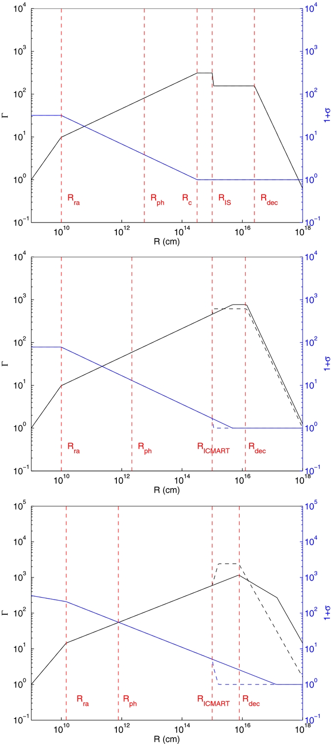 Figure 1. Examples of GRB jet dynamics. Black lines are for Γ evolution and blue lines are for σ evolution. Vertical dashed lines denote some characteristic radii: rapid acceleration radius rra, photosphere radius rph, coasting radius rc, internal shock radius