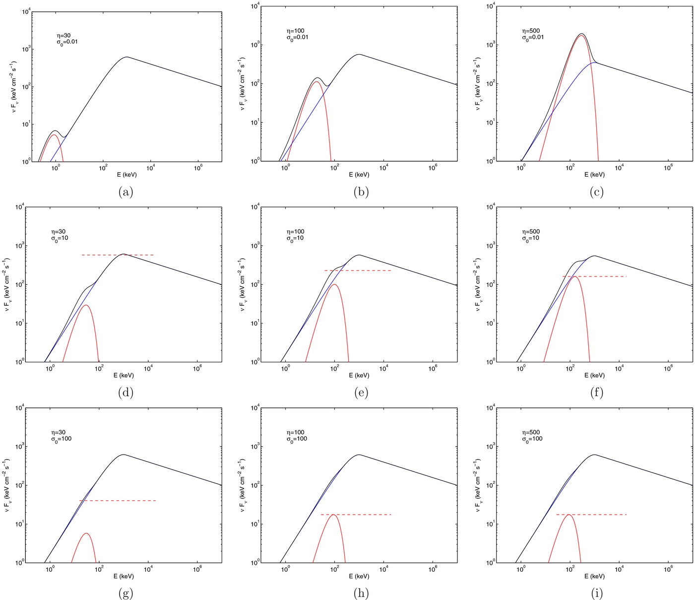Some example spectra are presented in Figure 3 for different (η, σ0) pairs as input parameters. For non-dissipative photosphere emission, we have assumed a blackbody spectrum. For dissipative photosphere emission, on the other hand, we only plot its flux level and the range of Ep defined by