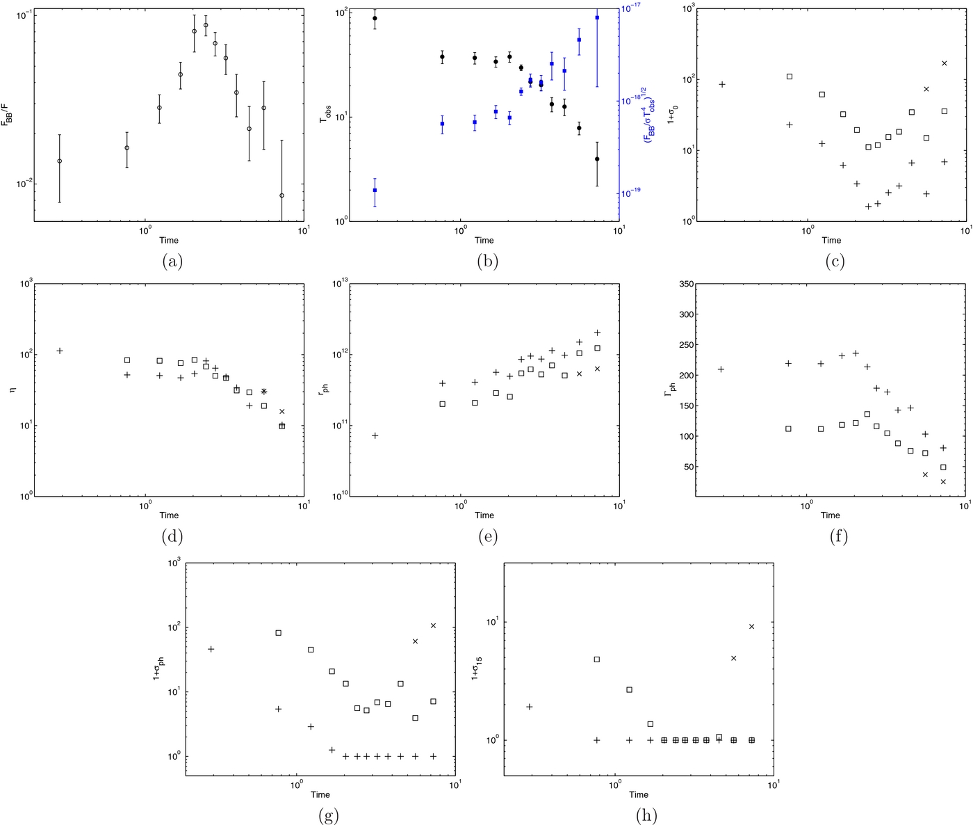 (b) evolution (Iyyani et al. 2013), along with the derived parameters of a non-dissipative photosphere and their evolution: 1 + σ0 (c), η (d), rph (e), Γph (f), (1 + σph) (g), and (1 + σ15) (h). The plus, square, and cross symbols denote the cases with r0 = 108 cm, 109 cm, and 1010 cm, respectively.